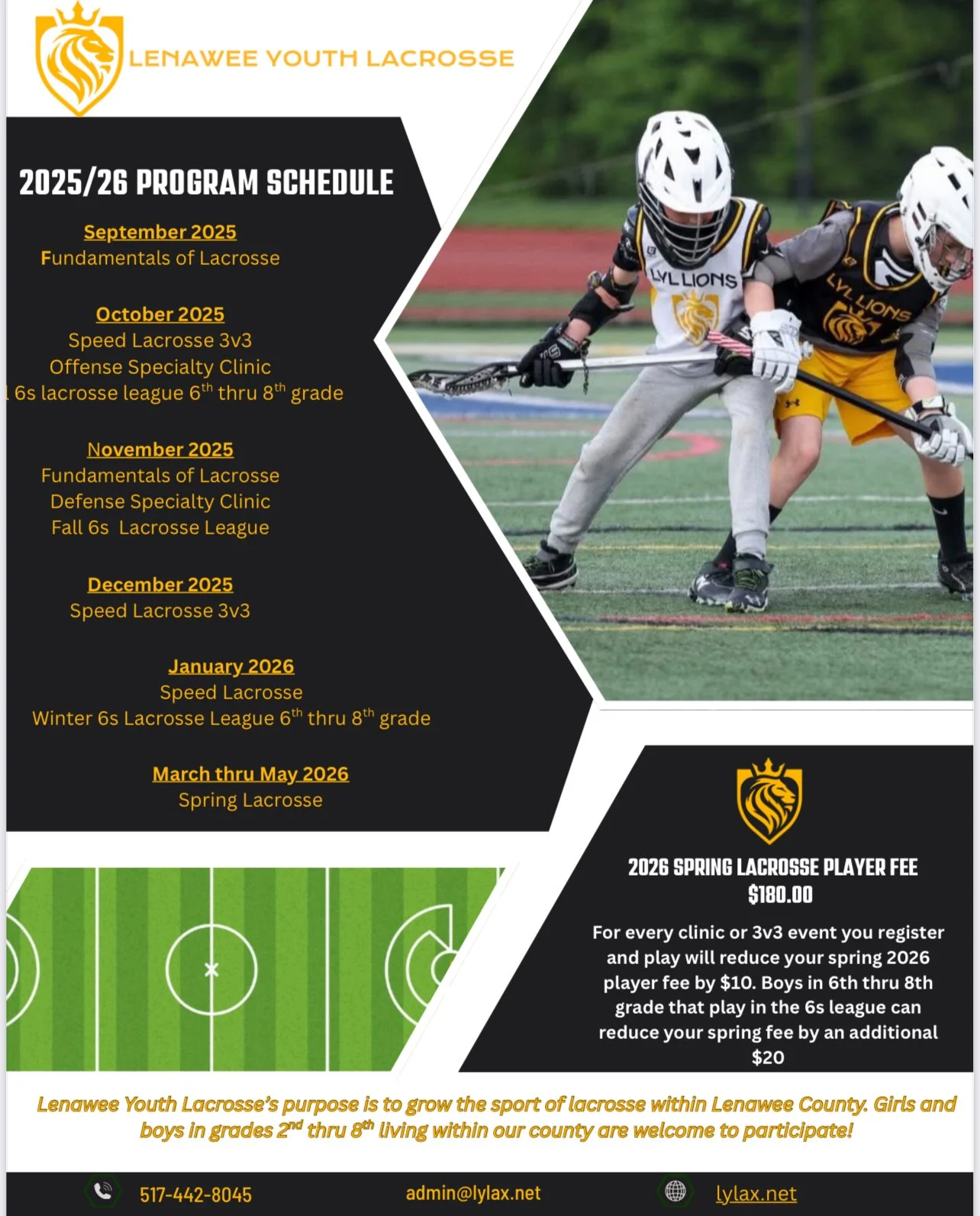 Lenawee Youth Lacrosse (LYL Lions) exists to grow the game of lacrosse by connecting with schools and youth organizations across Lenawee County. Our mission is to make lacrosse accessible to boys and girls of all backgrounds by providing a fun, safe, and high-quality program. Backed by US Lacrosse and the Michigan Youth Lacrosse Association, our trained and vetted volunteers are committed to teaching the game with integrity, enthusiasm, and care.